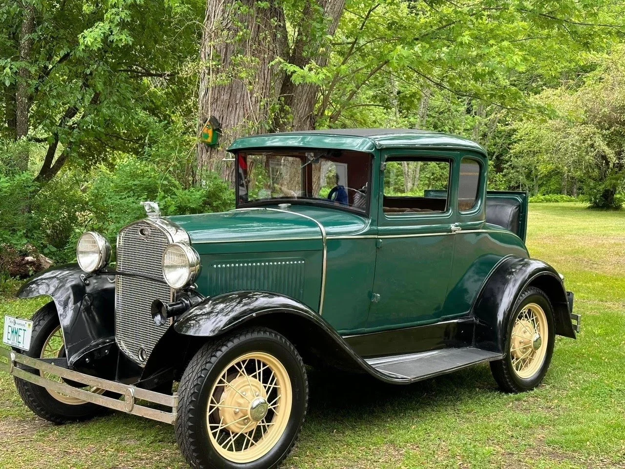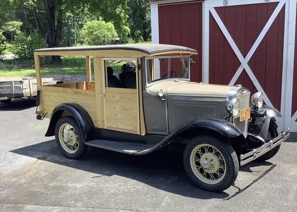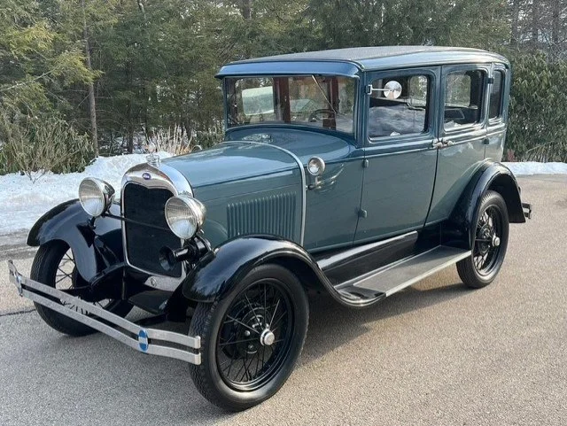 Vintage blue Ford Model A car parked on a road with a snowy background.