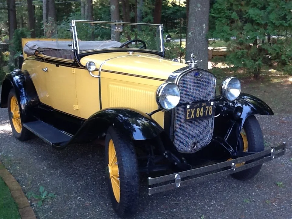 A vintage black Ford Model A with a tan convertible top, parked outdoors on a sunny day. The car has distinctive yellow spoke wheels and is part of a car gathering with other vehicles visible in the background.