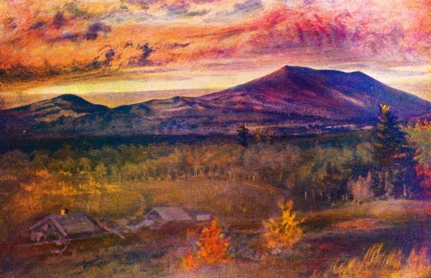 Autumn landscape painting with mountains, a colorful sky, and a forest below, featuring a few small houses in the foreground.